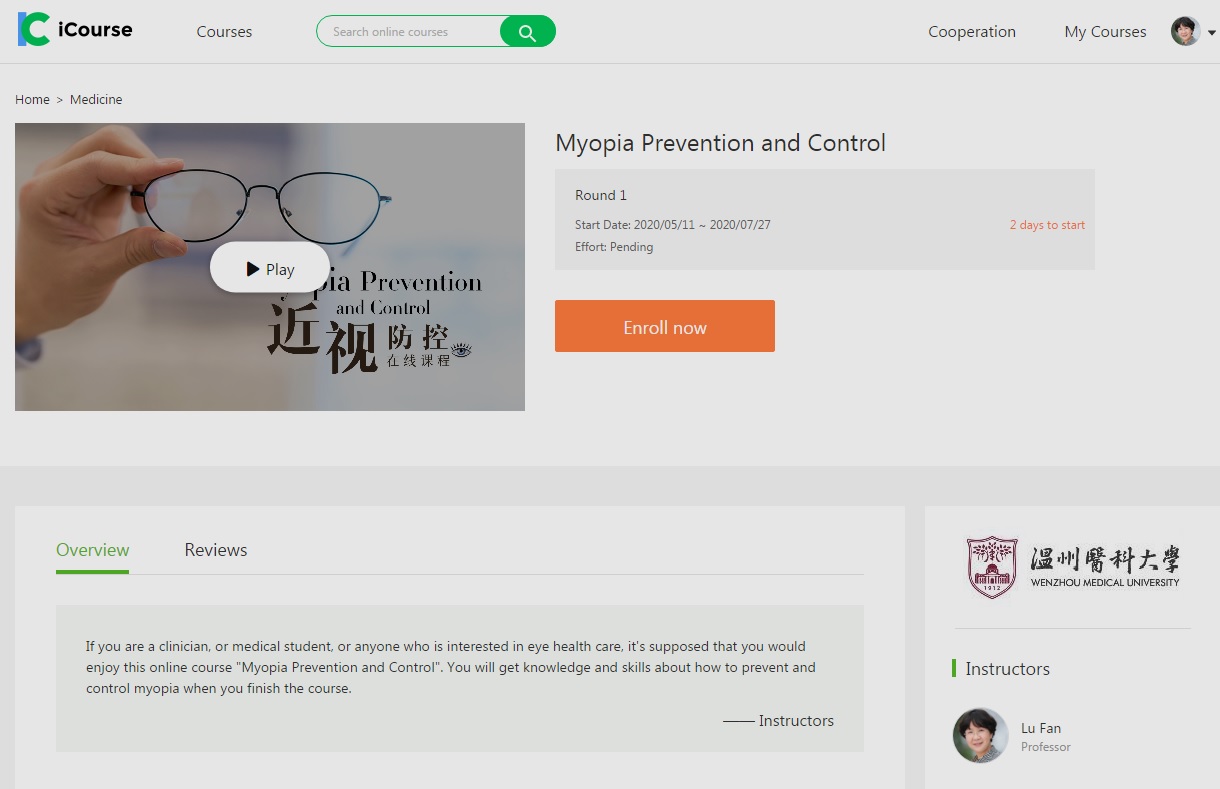 《近视防控》英文版在线课程由温州医科大学党委书记吕帆教授领衔的团队主讲,是iCouse国际慕课平台上眼视光领域首门国际在线课程。近年来,近视已经成为世界范围的高发疾病,近视率高居不下,不断攀升,低龄化重度化日益严重,成为影响人民群众特别是儿童青少年身体健康的重大公共卫生和社会问题。该课程旨在向全球临床医师和医学生宣传近视防控策略、普及近视防控医学知识、推广近视防治诊疗规范,为全球儿童青少年近视的普查和诊疗工作培养具有眼视光特长的医学人才。课程的主要内容包括近视的介绍、如何防范近视的发生、如何矫正近视、近视进展防控、近视普查、屈光不正的检查和验配等,并具体介绍了近视的多种矫正和控制方法,如框架眼镜、角膜接触镜学、角膜塑形镜、阿托品、近视激光手术、人工晶状体手术等。据悉,该课程中文版曾于2019年10月上线智慧树平台,累计选课5144人次,累计选课学校32所,累计互动9483次。