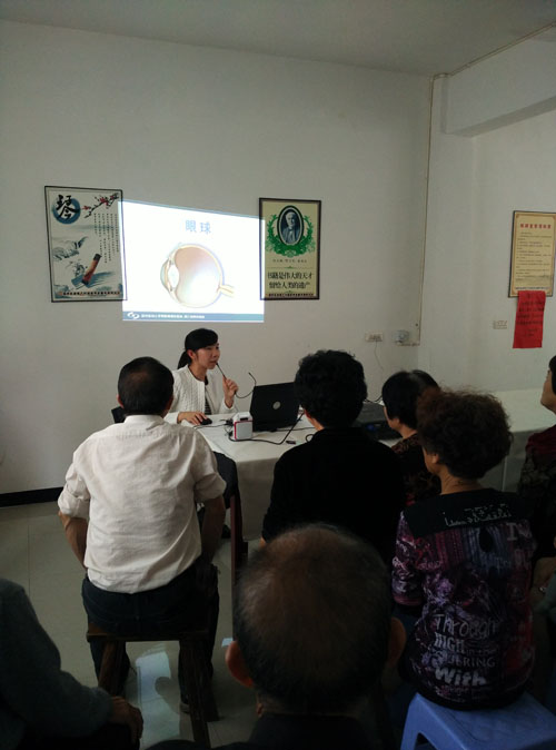 当天,由我院白内障专科叶凌颖博士在村会议室开展老年人眼部健康知识讲座。该次讲座先以眼部构造开始介绍,主要介绍了老年人常见的眼部疾病如白内障、青光眼、眼病病变、角膜炎、胬肉及常见的老花远视等疾病的症状预防及治疗方法,在座的老人们各个都听的非常认真。随后采取问答的模式,让在座的老人们提出他们心中的不解,叶医生尽心尽力的为他们回答,虽然在座的老人们的文化程度普遍不高,但整个活动并无传统讲座的那种沉闷,在座的老人们在询问中充分的了解到了曾经并不了解的知识,在场的老人觉得这样的讲座让他们这些没受过教育的老头老太也能晓得健康预防的重要性。