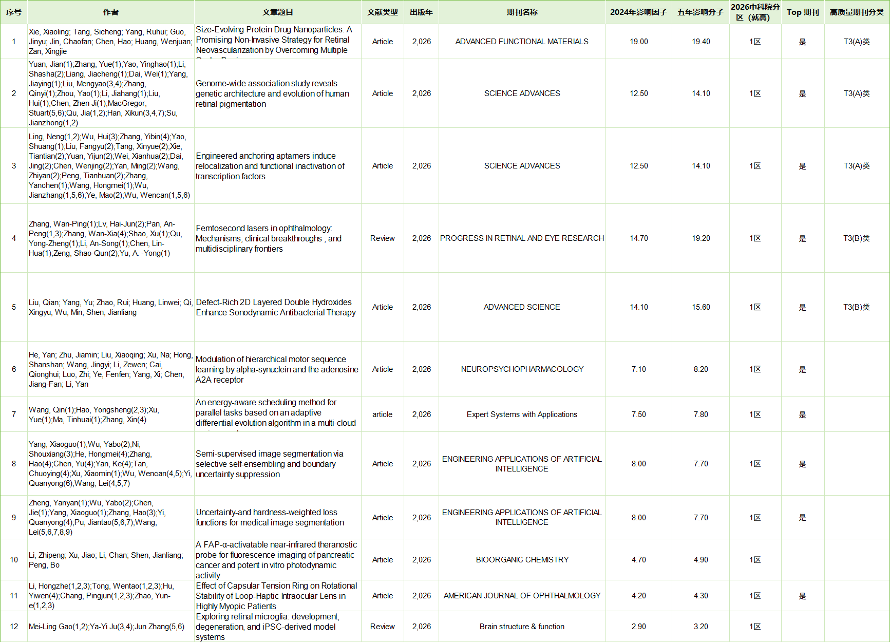 本期公布信息检索论文出版时间2026.01.01-2026.01.31(注:因wos收录滞后等原因后续有1月份新增发表文献继续增补到2月份文献统计中),外文文献(Article和Review类型),外文检索来源于Web of Science核心合集,中文检索来源于中国知网、万方等中文数据库。新增以本院为第一单位,排名第一的第一作者或最后通讯作者SCI论文22篇;1月份无中文论文发表。在这些SCI论文中,中科院1区论文12篇, 2区论文5篇;五年影响因子大于 9.0发表5篇, 5.0-9.0发表4篇,高质量期刊发文5篇,其中T3-A有3篇,T3-B有2篇, 具体见下表: