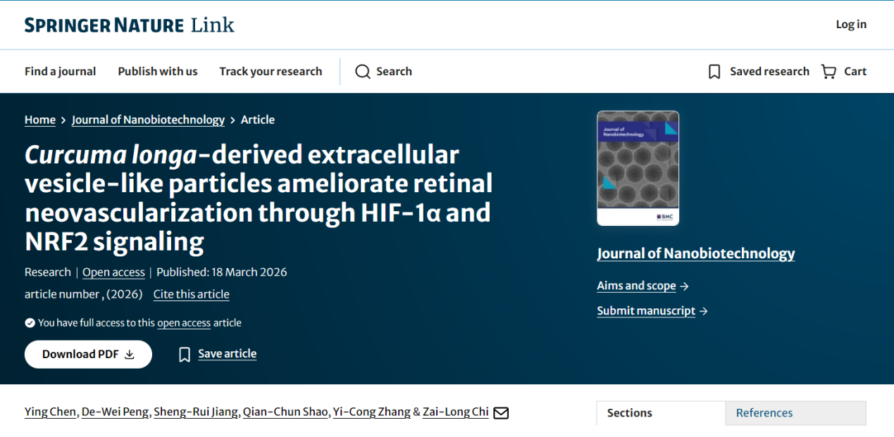 1. Chen Y, Peng DW, Jiang SR et al. Curcuma longa-derived extracellular vesicle-like particles ameliorate retinal neovascularization through HIF-1α and NRF2 signaling. J Nanobiotechnol. 2026 Mar 18.