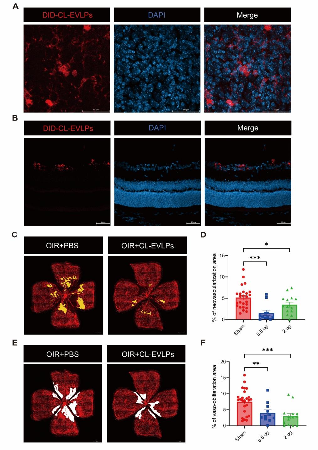 图2. CL-EVLPs抑制OIR小鼠视网膜病理性新生血管生成