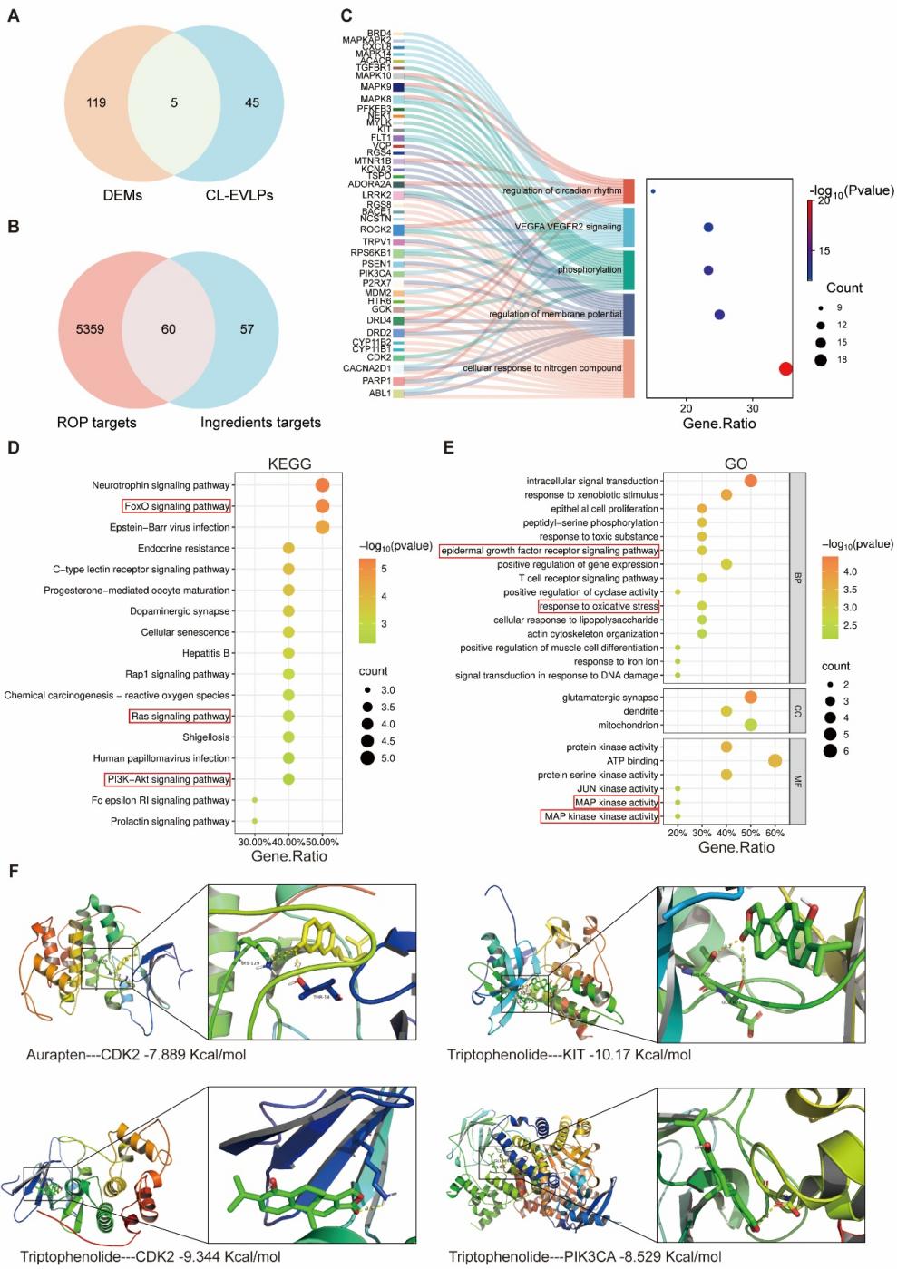 为了探究CL-EVLPs内容物中的哪个成分发挥作用,研究通过CL-EVLPs中高丰度化合物与OIR模型视网膜组织中差异代谢产物的交集,同时利用疾病靶基因数据库与小分子化合物预测调控靶基因数据库进行交集,发现相关生物学功能与信号通路富集于MAPK活性及PI3K-AKT通路等,印证了上述调控机制的发现(图5A-E)。图5F展示了两个生物活性分子Auraptene和Triptophenolide与靶基因的计算机模拟分子对接模型,CDK2、KIT和PIK3CA均富集于‌PI3K-AKT信号通路‌。进一步,体外实验亦证明了Auraptene和Triptophenolide的潜在作用(详见论文补充数据)。