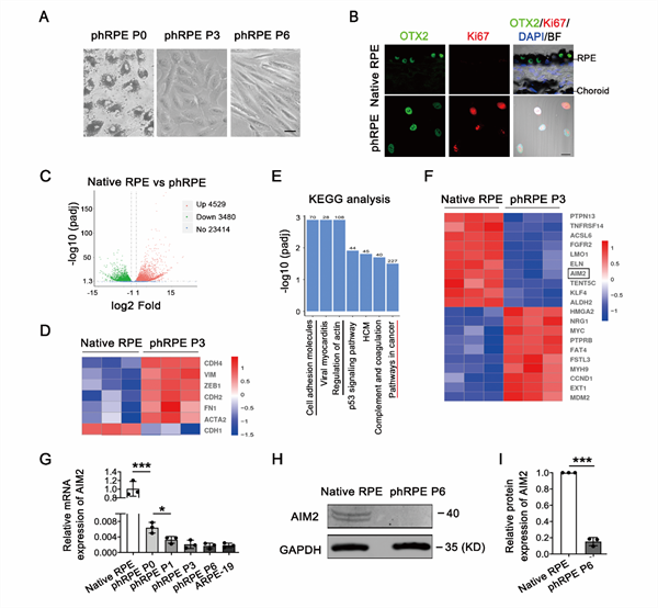 RPE细胞在正常生理状态下是位于神经视网膜和脉络膜之间,处于相对静止状态的单层色素上皮细胞,为了探寻RPE - EMT过程中关键的基因和通路,研究人员从人眼中分离出RPE组织,对其进行酶消化和传代培养以诱导EMT和增殖(图1A、B)。通过RNA - Seq分析静息状态的RPE细胞和发生增殖EMT转变的RPE细胞的差异转录组谱型,从中发现抑癌基因黑色素瘤缺乏因子2(AIM2)在静息状态的人原代RPE(phRPE)中高表达,在发生EMT和增殖的phRPE细胞中显著下调(图1C-I)。