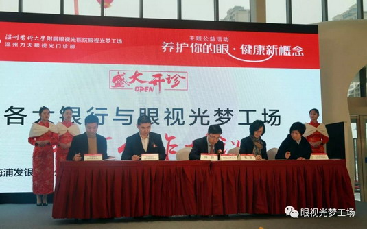 同时,眼视光梦工场也迎来了首批三家,即温州浦发银行五马支行、温州招商银行国鼎支行、中国平安银行(黄龙支行)的“VIP视觉健康服务基地”合作单位,通过“团体预约”,为其客户提供眼健康检查,让组团专业养眼不再是梦。