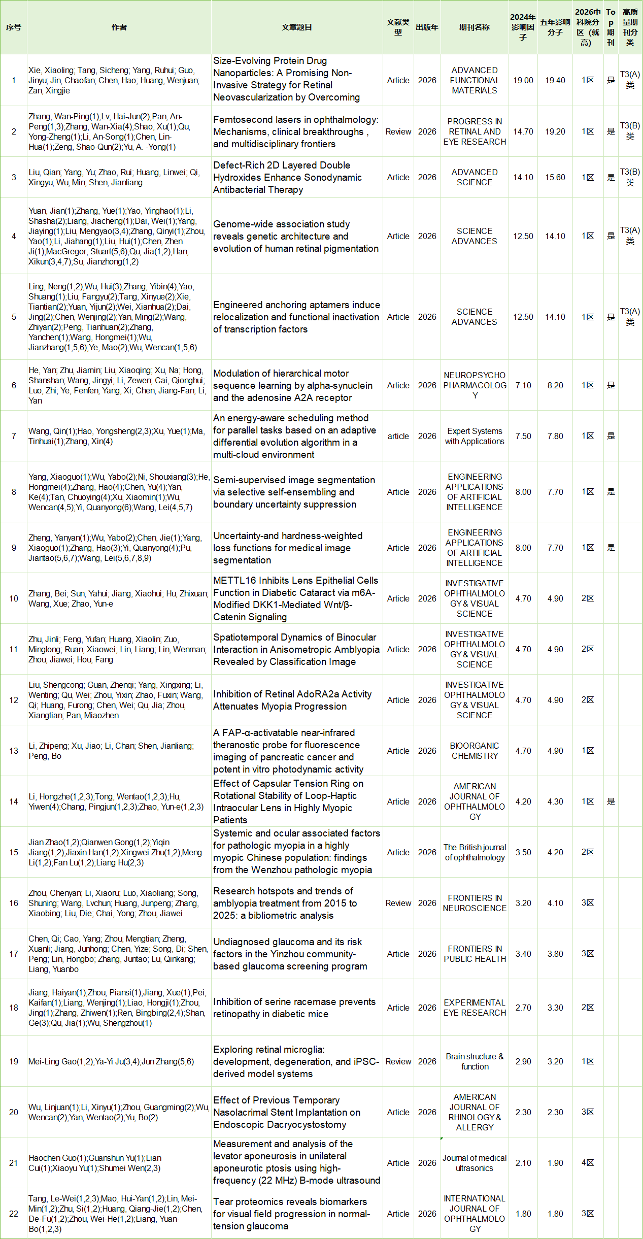 本期公布信息检索论文出版时间2026.01.01-2026.01.31(注:因wos收录滞后等原因后续有1月份新增发表文献继续增补到2月份文献统计中),外文文献(Article和Review类型),外文检索来源于Web of Science核心合集,中文检索来源于中国知网、万方等中文数据库。新增以本院为第一单位,排名第一的第一作者或最后通讯作者SCI论文22篇;1月份无中文论文发表。在这些SCI论文中,中科院1区论文12篇, 2区论文5篇;五年影响因子大于 9.0发表5篇, 5.0-9.0发表4篇,高质量期刊发文5篇,其中T3-A有3篇,T3-B有2篇, 具体见下表: