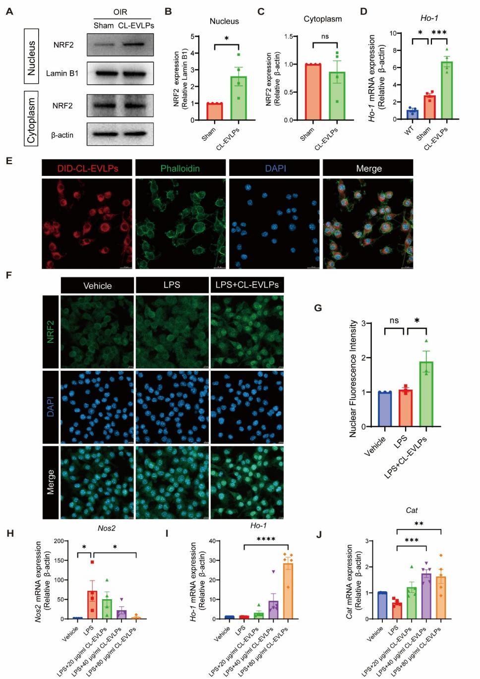 鉴于CL-EVLPs在抗氧化应激方面显示出的潜能,进一步实验验证了抗氧化相关信号通路。在 OIR 小鼠视网膜中,CL-EVLPs明显促进 NRF2 进入细胞核,并上调其下游抗氧化因子Ho-1表达(图4A-D)。体外实验亦表明CL-EVLPs促进小胶质细胞中NRF2的核转移,同时抑制氧化因子 Nos2 的表达,并上调抗氧化因子Ho-1和Cat的表达(图4E-J)。体内外实验均表明了CL-EVLPs能够增强视网膜组织对氧化应激损伤的抵御能力。