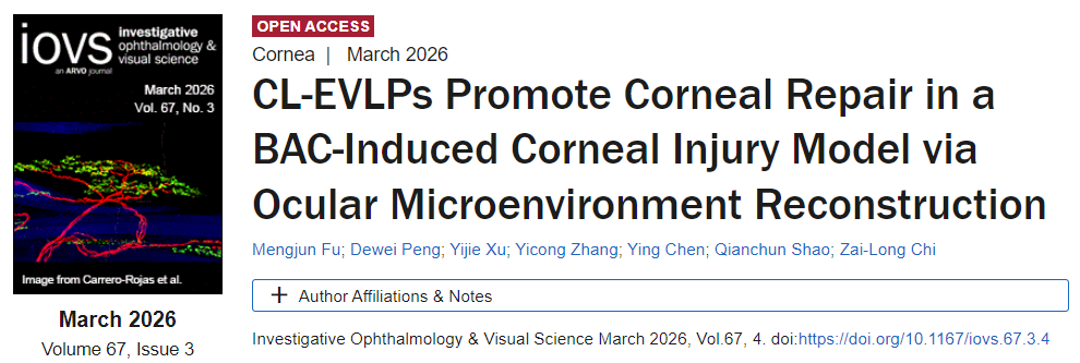 2. Fu M, Peng D, Xu Y, Zhang Y, Chen Y, Shao Q, Chi ZL. CL-EVLPs Promote Corneal Repair in a BAC-Induced Corneal Injury Model via Ocular Microenvironment Reconstruction. Invest Ophthalmol Vis Sci. 2026 Mar 2; 67(3): 4. doi: 10.1167/iovs.67.3.4.